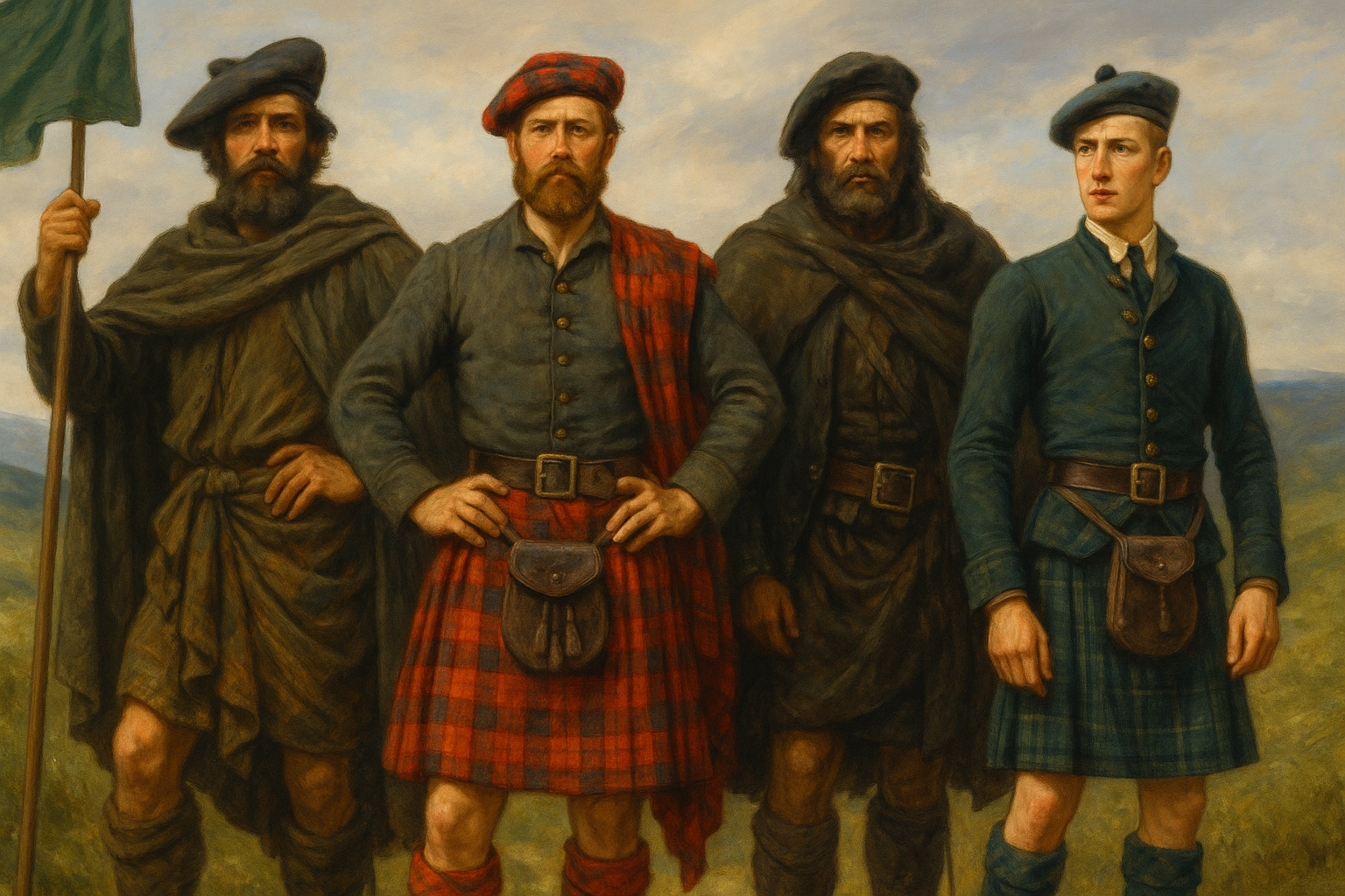 Long before the modern tailored kilt appeared, Highland Scots wore heavy woollen cloaks and tunics to survive the cold, wet climate. Over time these garments evolved into the Great Kilt (Feileadh Mòr) — a large length of tartan cloth that was wrapped around the waist and thrown over the shoulder like a cloak. It worked as clothing, blanket and rain protection all in one, making it ideal for life in the Highlands.